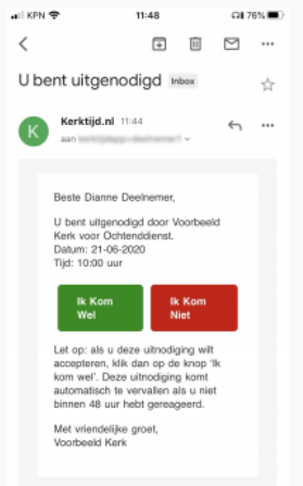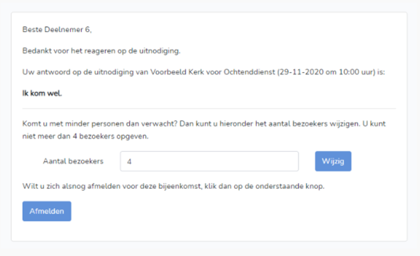 Met de groene knop bevestigt u de uitnodiging en komt u op de bezoekerslijst te staan en met de rode knop geeft u aan dat u niet komt. Het systeem zal dan vervolgens andere gemeenteleden uitnodigen.